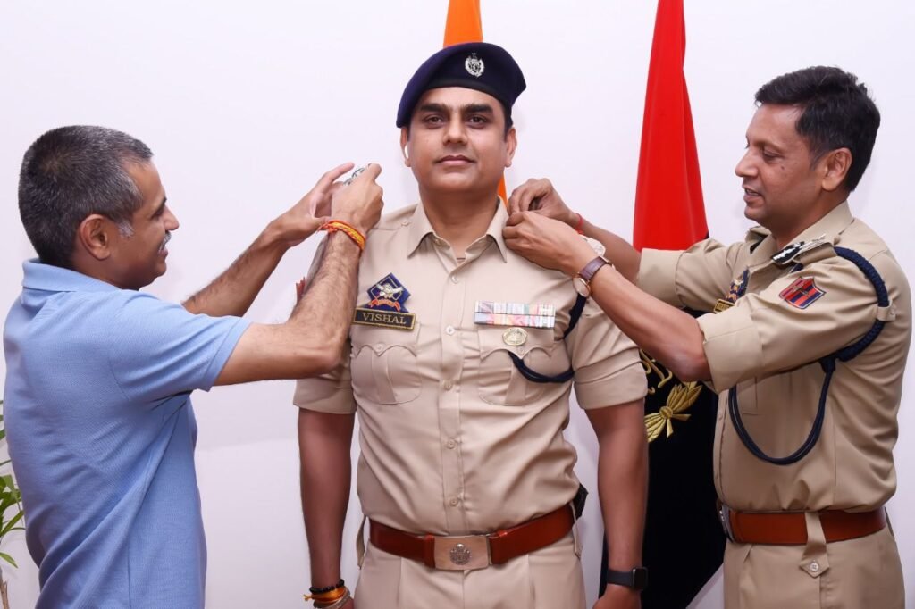 JAMMU: Additional Director General of Police Mukesh Singh as well as DIG, Vivek Gupta pinned ranks to Inspector Vishal Sharma on his promotion as Deputy Superintendent of Police.
