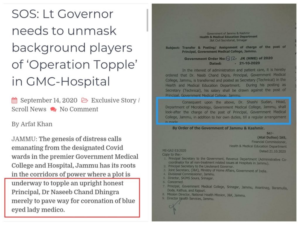 JAMMU: Endorsing our reporting wherein we exposed a plot in GMC&H to dislodge upright and honest Dr Nasseb Chand Digra from the post of Principal to install one blue eyed lady medico on the prestigious post, the Govt today appointed Dr Shashi Sudan as new Principal after romoving Dr Digra.