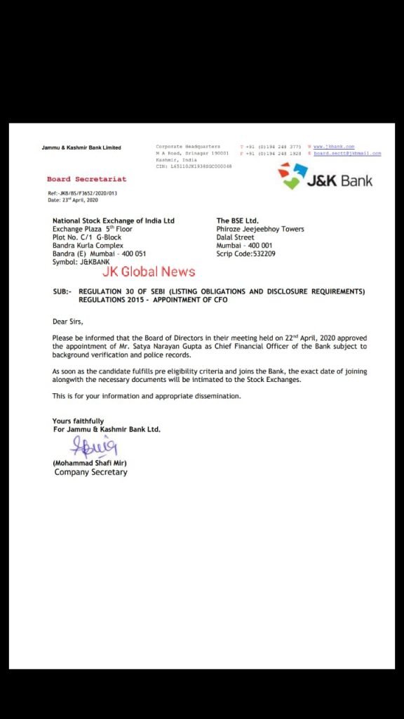 Referring to the amendment of Ministry of Home Affiars (MHA) in its notification issued on April 1,2020 wherein it modify its earlier order of keeping reserved only level 4 posts for residents of UT JK, a senior officer of the bank said “ The Government can appoint non domicile to the bank Board of Directors but opening doors for non domicile at executive level of the bank is seems to be an alarming trend”