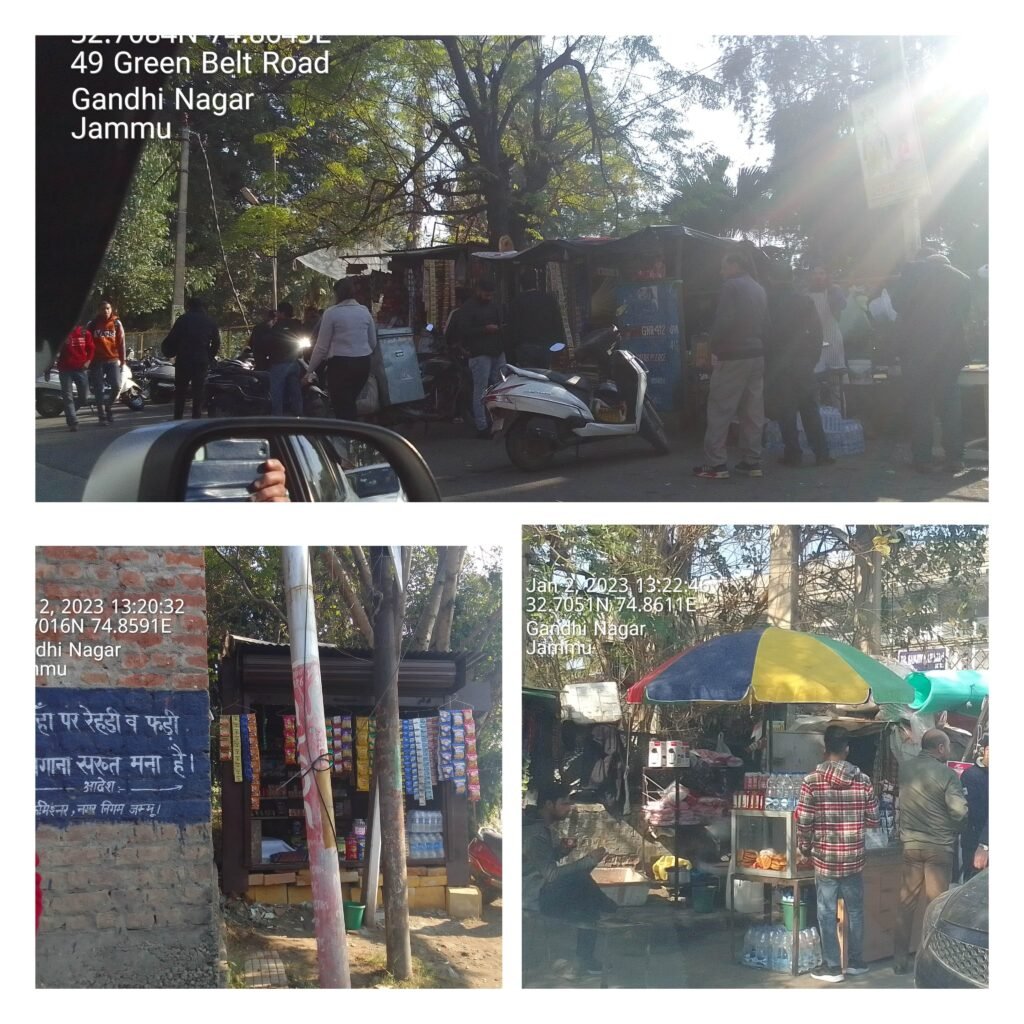 At Green belt park in Gandhi Nagar, the presence of score of static kiosks opposite Jammu and Kashmir Housing Board is a glaring example of the malfunctioning of JMC, JKHB as well as police who are all indifferent to the nuisance created by these encroachers on the road in broad day light.