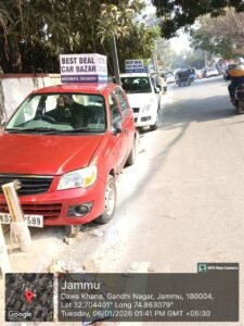 Residents of Gandhi Nagar pointing running of open car bazars on public space near VLCC and Auqaf Market asserted that despite repeated complaints, the Jammu Municipal Corporation and allied enforcement agencies appear unwilling or unable to act against unauthorised open car bazaars.
