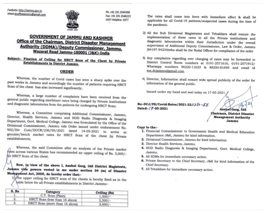 JAMMU: Taking cognisance of large scale complaints of loot against private diagnostic centres as well as laboratories on the name of CT scan amid pandemic, the Deputy Commissioner, Jammu, Anshul Garg has fixed upper ceiling of rates for undergoing HRCT scan of chest at all private establishments in Jammu District.