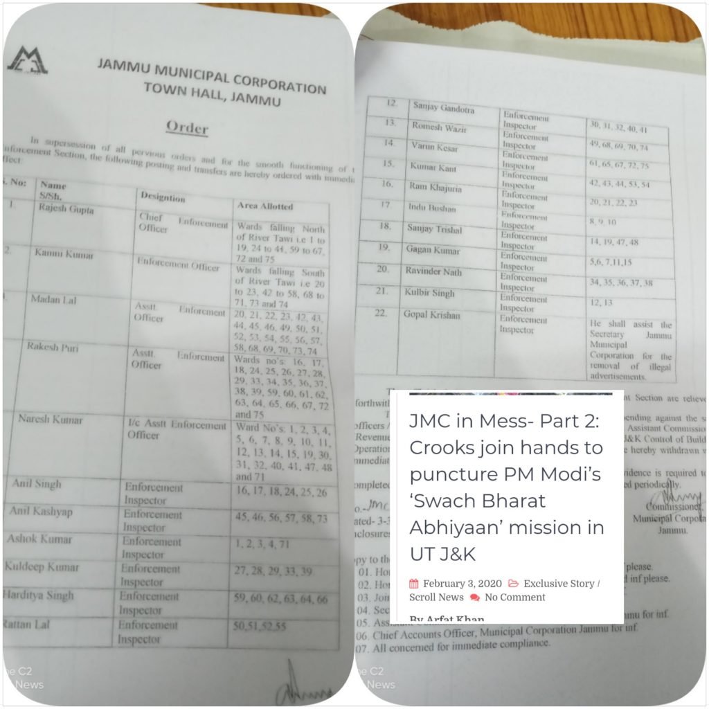 As per the order No JMC/Estt/11274-80 dated 3/3/2020, while releiving secretary JMC as well as ACR from the powers of 7(1) and 12(1) under J&K Building Operation Control Act, 1988, Avny has also relieved the officers of sanitation wing from the additional burden of enforcement work.