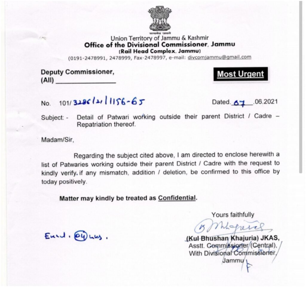 In this connection, letter No -101/3286/21/1156-65 dated 7/6/2021 has urged upon all the District Commissioners of Jammu districts to treat the matter as most urgent and verify the details of Patwaris enclosed pertaining to their posting outside parent district.