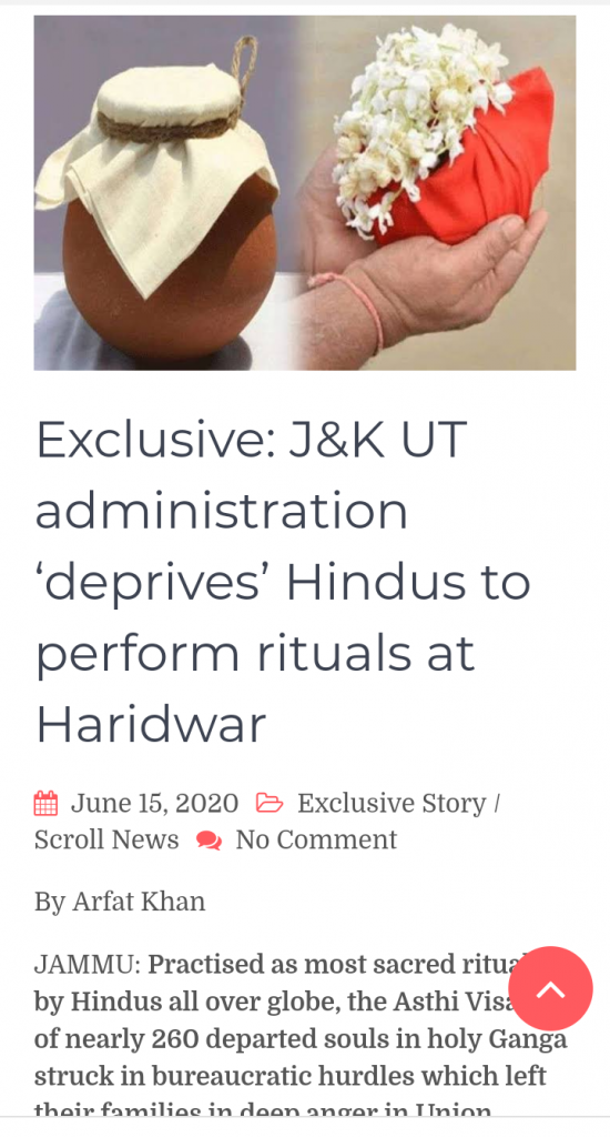 Sources in LG office disclosed that reacting to the exclusive story published by JK Global News on dated June 15 highlighting the prolong delay by the office of Divisional Commissioner, Jammu in issuance of permission to nearly 521 Hindu families for performing the Asthi Visarjan in holy Ganga at Haridwar, the directon was issued to the concerned office for prompt action