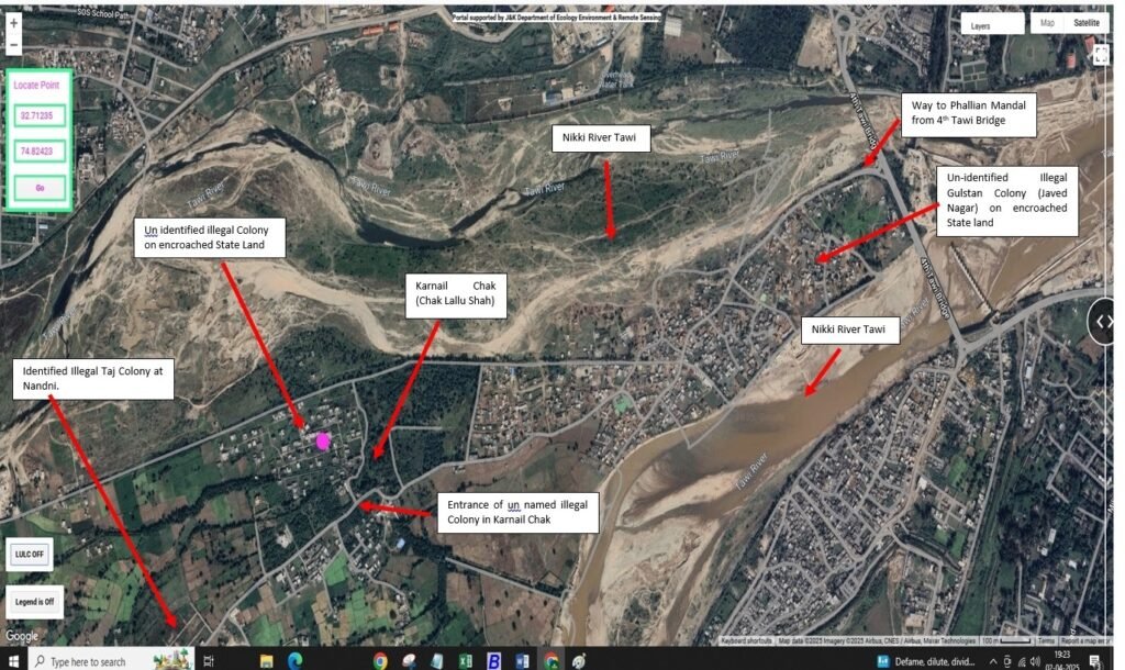 JAMMU: Emboldened by the government’s failure to act decisively against unscrupulous colonizers and land mafia, the chunk of land located between two streams of River Tawi in Phallian Mandal has become a hub of alarming unlawful constructions and imbalanced human settlement. This area falls under the jurisdiction of the Jammu Development Authority and  designated as open space in the land use plan of the Jammu Master Plan-2032.