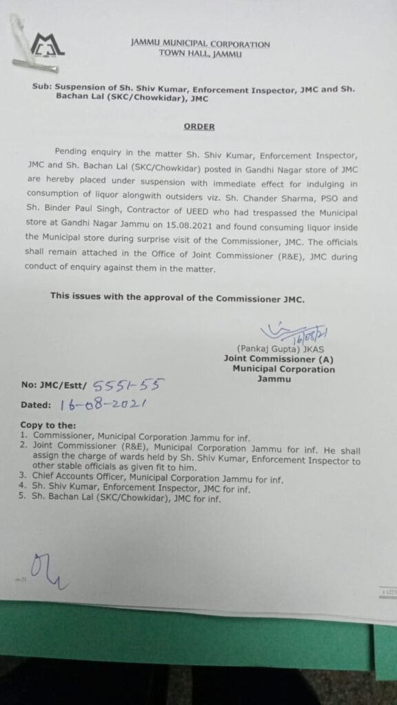 “In a surprise visit by the Commissioner, two employees of the JMC namely Shiv Kumar (Khilafarzi Inspector) and Bachan Kumar (Chowkidar) were seen consuming liquor inside a room in Gandhinagar store alongwith two outsiders identified as Constable Chander Parkash deployed as PSO with an IAS officer and one contractor of UEED” reads the order.