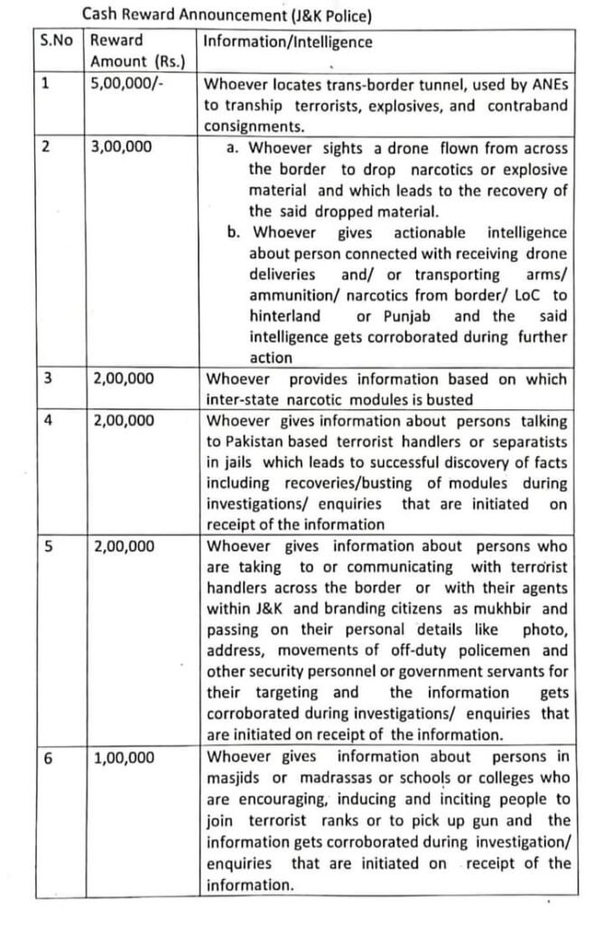 Ranging from Rs one lakh to 12,50,000, the prize amount will be awarded in seven categories. The civilians can share the information about tunnels, drugs, drones, terrorists, person encouraging anti national activities in educational institutions- place of worships and in touch with handlers of terrorists across the border.
