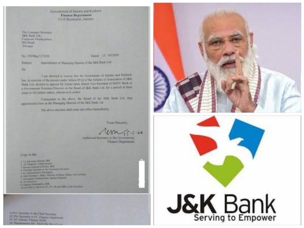 Vide order No-FD/Bkg/12/2020 dated 15-05-2020, the Finance Department appointed Zubair Iqbal as Director /Govt nominee on the Board of J&K Bank for three years and further directed the BoD to appoint him as Managing Director with immediate effect.