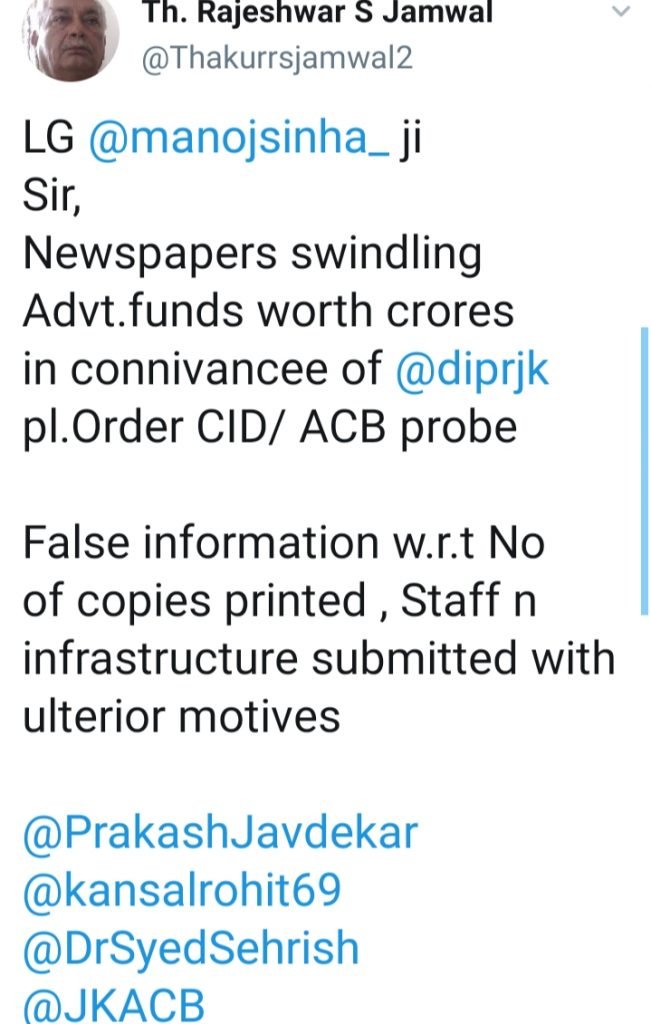 In a tweet to LG Manoj Sinha, RTI activist Rajeshwar Singh Jamwal alleged that most of the newspapers despite claiming to be leading surprisingly invisible in the market.
