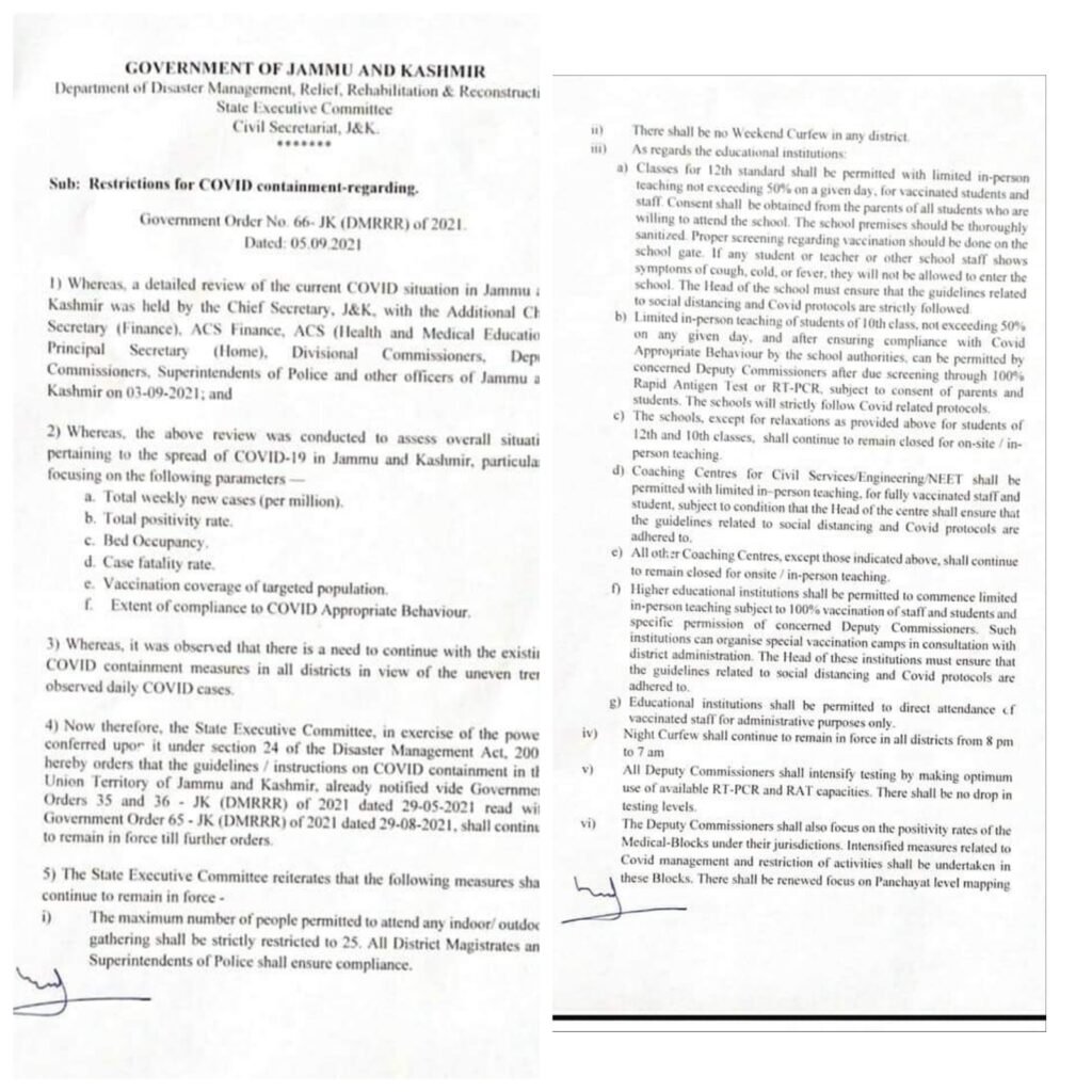 JAMMU: Hinting at re opening of schools in a phased manner, the government on Monday ordered reopening of 10th and 12th classes for vaccinated students, with 50% capacity.