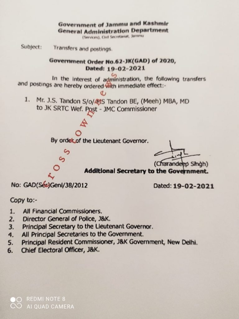 Confirming the order as forged, the sources in GAD said that it’s fake. The order bearing the No 63 JK (GAD) of 2021 dated 19/2/2021 carried signature of Additional Secretary Charandeep Singh.